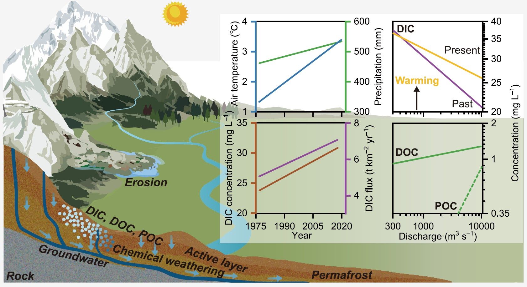 The Arctic region has shown clear decadal increases in DIC and alkalinity fluxes across major rivers including the Mackenzie, Yenisei, and Ob Rivers in a warming climate. Outside the Arctic, high-elevation and mountainous regions experience the most rapid climate warming. Such regions potentially act as sentinel sites, offering early glimpses of climate change impacts on fluvial biogeochemistry. The Qinghai-Tibetan Plateau (QTP), referred to as the “Earth’s Third Pole” and “Asian Water Tower”, stands as the highest and most extensive orogenic plateau in the world. Over the past four decades, warming has elevated air temperature and moisture in the QTP, affecting local atmospheric, hydrological, and biogeochemical cycles. Despite a comprehensive knowledge of hydrologic responses to warming, the responses of fluvial biogeochemistry to warming remain poorly constrained in the QTP and in other high-elevation landscapes outside the Arctic.