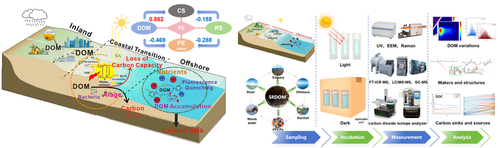 Recently, Professor Qi Yulin's research group from the Biogeochemical Cycling Research Center of our institute has conducted studies on the degradation patterns of organic carbon at the LOAC interface in the Bohai Rim region under the influence of special events such as rainfall, wastewater discharge, and pollutant release. Through laboratory experiments combined with spectroscopic, chromatographic, mass spectrometric, and isotopic techniques, the group quantified the priming effect of organic carbon in the Haihe River Basin and revealed the changes in the sources, molecular composition, and structural characteristics of organic carbon caused by the PE. The research results indicate that: the PE widely occurs in aquatic system, especially in estuary zone and under the rainfall condition, and the impact of emerging contaminants on the PE cannot be ignored as well. Estuary zone serves an important region for the research of carbon budget imbalance due to its strong PE, while the negative PE in the offshore zone contributes the stable carbon sink in the ocean. During the PE process, DOM tend to shift from humus-like substances to small molecular weight and protein-like substances, and the carbon sources gradually transform from terrestrial to microbial. In addition, the molecular structures also play crucial roles in carbon sequestration in the coastal area. DOM containing carboxylic and heteroatoms functional groups are more sensitive and prefer to be degraded in aquatic system, and humus-like substances contribute to a positive PE while tyrosine can slow down the DOM degradation. Finally, special parameters such as BDOC, AI-mod, Corg/Ntotal, along with the humus-like substances and specific molecular markers can be utilized to track the occurrence of the PE.