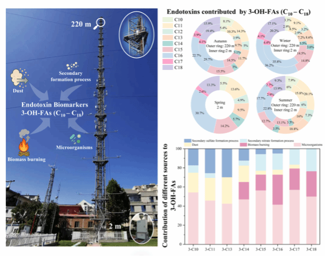 Endotoxins from Gram-negative bacteria in urban air pose health risks, but their vertical and seasonal patterns remain poorly understood. To address this issue, Professor Fu Pingqing’s team at Tianjin University sampled inhalable particles (PM10) from the heights of 2 m and 220 m using a 255 m meteorological tower in the coastal megacity Tianjin, North China. By applying UPLC-MS analysis of 3-hydroxy fatty acids (3-OH-FAs), they quantified endotoxin levels, revealing higher concentrations near the ground and seasonal peaks in winter. Notably, bioactive endotoxin levels in winter exceeded the exposure threshold, indicating potential public health risks.