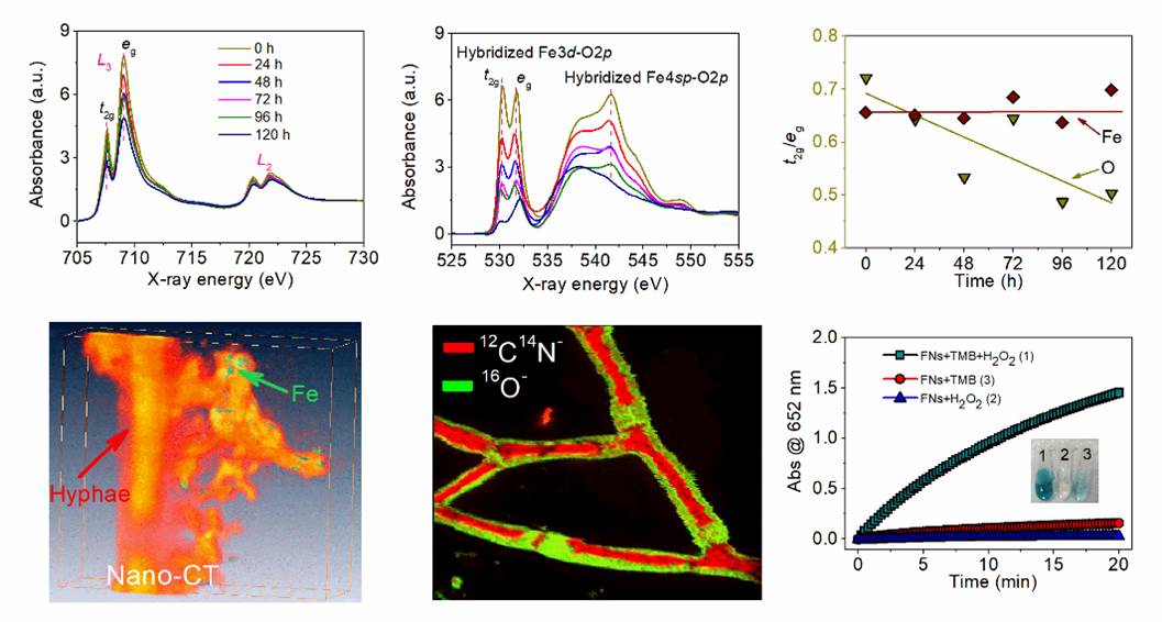 In this research, Prof. Yu et al. have shown that biogenic ferrihydrite nanoparticles are extensively formed at the interface between an actively growing fungus and an iron-containing mineral, hematite. These biogenic nanoparticles formed through the fungus-hematite interactions can behave as mimetic catalysts, similar to nanozymes that imitate peroxidase which scavenges hydrogen peroxide for the mitigation of potential cytotoxicity. Evidence from various X-ray spectroscopic analyses, including soft X-ray absorption spectroscopy (XAS) and X-ray photoelectron spectroscopy (XPS), indicated that non-lattice oxygen in the nanomaterials was chiefly responsible for this catalytic activity, rather than through the conventional mechanisms of iron redox chemistry. Cryo-scanning electron microscopy, high-resolution (~30 nm) Nano-CT, and biomass analyses further confirmed that the organism was active and capable of mediating the catalytic reactions. Prof. Yu et al. therefore hypothesize that this confers an advantage to the organism in terms of protection from oxidative stress and ensuring the acquisition of essential iron.