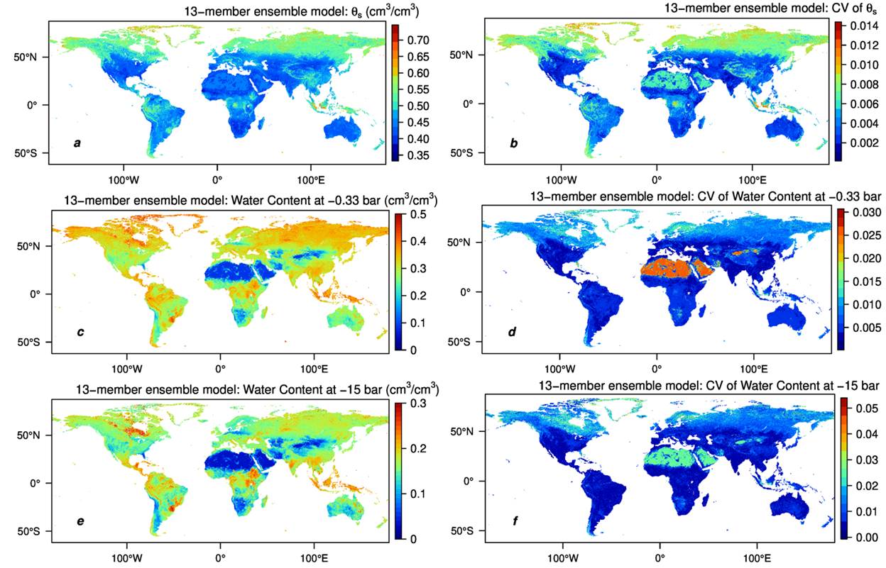 Figure. Global maps of mean values and coefficients of variation (CV) of saturated moisture content (a and b), moisture content at -0.33 bar (c and d), and -15 bar (e and f) in 10 km resolution from overall 13-PTF ensemble model for the surface layer. Calculations are based on the surface soil of the OpenLandMap 250 m resolution data but the maps are plotted in the center of the 10 km pixel.