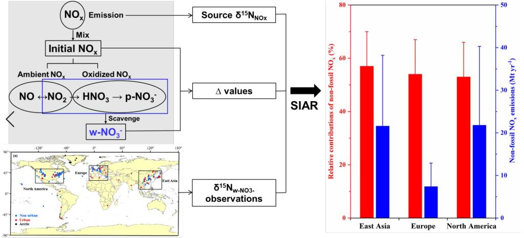 Anthropogenic activities have led to the continuous accelerating of reactive nitrogen in the terrestrial atmospheric system since the Industrial Revolution, which has become one of the most prominent global environmental issues. The main cause of increasing atmospheric nitrate (NOy) pollution and deposition flux was assumed to be the emission of nitrogen oxide (NOx) from fossil fuel combustion, primarily via coal combustion and vehicle exhausts. However, due to the difficulty in constraining the emission intensity of non-fossil NOx emissions (such as microbial nitrogen (N) cycles in soils and biomass burning) and its contribution to atmospheric NOx, the relative contributions of fossil-fuel and non-fossil NOx atmospheric NOx, and total NOx emissions are unclear. This can affect the formulation of atmospheric NOx reduction strategies, the budget of N deposition fluxes, and the assessment of ecological effects of N deposition.