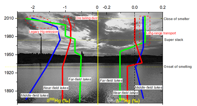 Nature archives record atmospheric mercury (Hg) depositions from directly emitted Hg and reemitted legacy Hg. Tracing the legacy versus newly deposited Hg is still, however, challenging. Here, we measured Hg isotope compositions in three dated sediment cores at different distances from the Flin Flon smelter (Figure 1), the largest Canadian Hg sources to the atmosphere during the 1930s-2000s. During the smelter’s operative period, Hg isotope compositions showed limited variations in the near-field lake (<10 km) sediments but were rather variable in middle- (20-75 km) and far-field lake (~800 km) sediments (Figure 2). Only the post-2000 sediments in middle/far-field lakes showed significantly negative Hg isotope shifts, while sediments from the 1970s-1990s had Hg isotope values resembling those of near-field lake post-1930 sediments. We suggest that the smelter’s peak Hg emissions during the 1970s-1990s, which coincided with the deployment of a super stack in the mid-1970s, largely increased the long-range dispersion of smelter plumes. For the top post-2000 sediments, the fugitive dust from ore tailings and terrestrial legacy Hg reemissions dominated Hg deposition in near-field lakes and middle/far-field lakes, respectively.