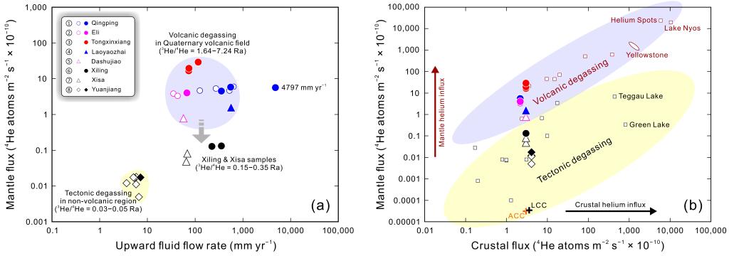 Fig. 1. Mantle 4He fluxes versus upward fluid flow rate (a) and crustal 4He fluxes (b) for hot springs in the Simao block.