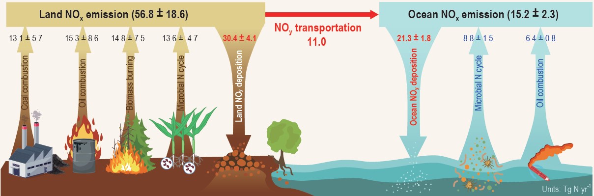 A better understanding of the surface-earth nitrogen (N) cycle is crucial in the Anthropocene because it strongly interacts with environmental quality, food production, biosphere and climate changes. Over the past century, atmospheric N loading has become a major driver of air pollution, ozone-layer destruction, elevated N deposition, and associated negative impacts on ecosystem structure and functions (e.g., biodiversity, acidification, eutrophication, and carbon balance). Nitrogen oxides (NOx) are major components of reactive N pollutants. Its concentrations and deposition fluxes have been remarkably elevated since the industrial revolution, which has been attributed to fossil fuel NOx emissions dominated by coal and oil combustion. Recently, non-fossil fuel NOx emissions from biomass burning and microbial N cycle have been recognized as important sources of atmospheric NOx. However, due to the incomplete or missing NOx emissions from the microbial N cycle in the land and ocean, there is great uncertainty in global NOx emissions. To accurately constrain global NOx emissions is pivotal to mitigate NOx emissions, budget nitrate (NO3-) deposition fluxes, and evaluate the eco-environmental and climatic effects of atmospheric NOx loading.