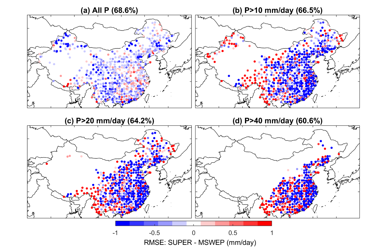 Figure 2. Comparison of SUPER and MSWEP. Blue dots represent the meteorological stations that suggest SUPER outperforms MSWEP.