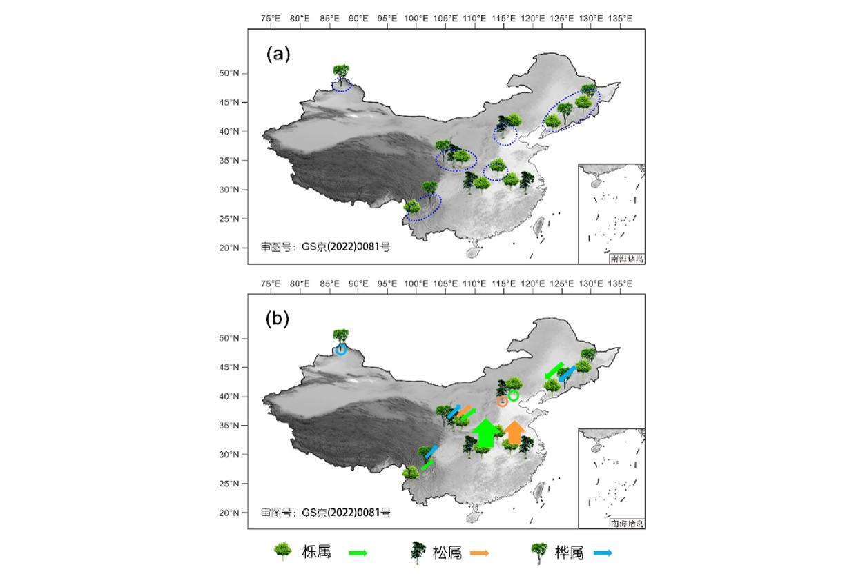 Figure 1 Conceptual model for the tree genus refugia during the LGM (a) and the migration pattern during the postglacial period (b).