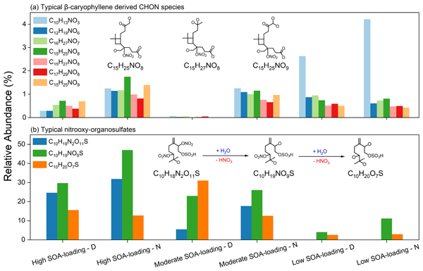 Figure: (a) Relative abundance distributions of typical CHON compounds derived from β-caryophyllene, and (b) relative abundance distributions of typical nitrooxy–organosulfates.