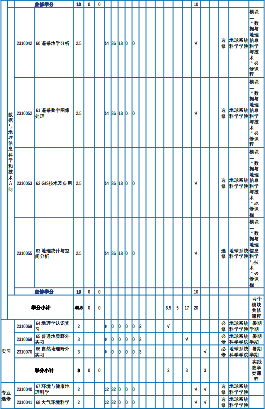 普通地质学实验与实践、普通地球化学实验与科研实践、土壤学与土壤地理学实验、地图学与地理信息系统概论上机、遥感地学分析上机、GIS技术及应用上机、遥感数字图像处理上机及地理统计与空间分析上机实践等。