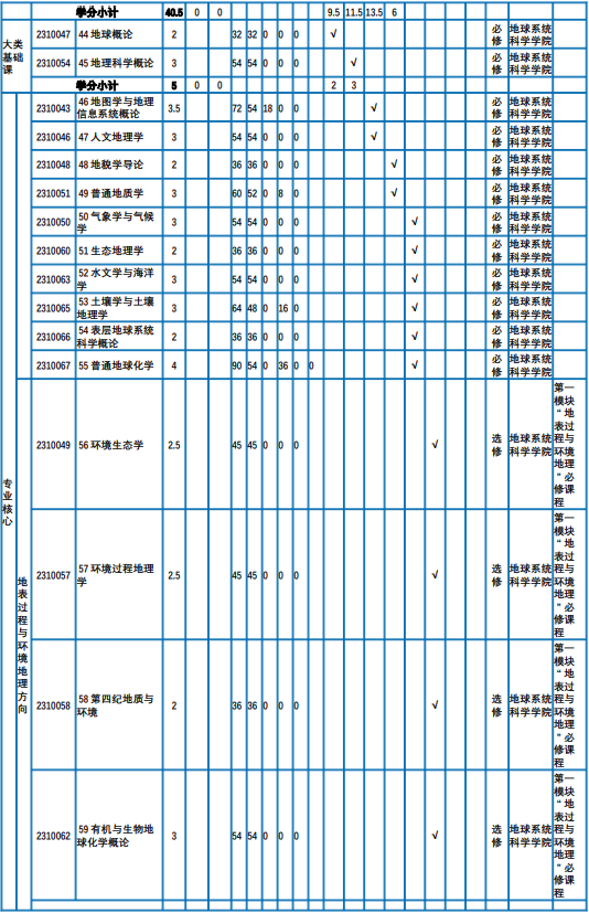 地球概论、地理科学概论、表层地球系统科学概论(含全球变化与可持续发展)、人文地理学、地图学与地理信息系统概论、普通地质学、地貌学导论、土壤学与土壤地理学、气候学与气象学、水文学与海洋学、生态地理学、第四纪地质与环境、普通地球化学、环境生态学、有机与生物地球化学概论、环境过程地理学、遥感地学分析、GIS技术及应用、遥感数字图像处理、地理统计与空间分析等。