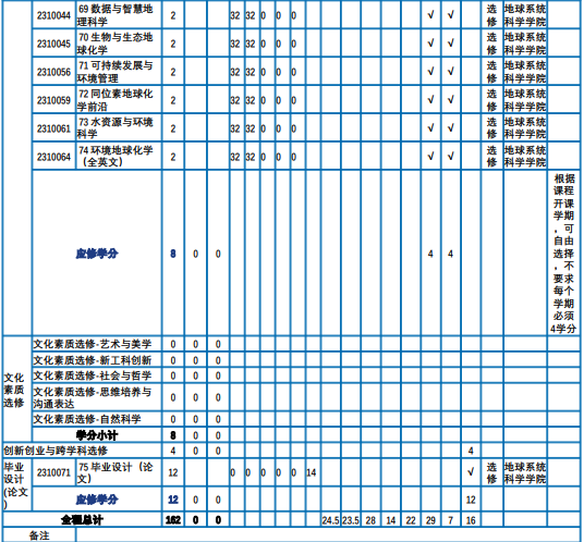 本专业培养适应我国社会主义建设实际需要,德智体美劳全面发展,具有健全人格和强壮体魄;具有正确的世界观、人生观和价值观;具有高素质人才所必须的人文社科基础知识和人文修养;具有较强的自然科学基础;具有国际化视野和受到严格科学思维的训练;具备较强的社会适应能力和现代地理学实践能力。掌握自然地理学和地理信息科学与技术的基础知识、基本理论、分析方法和应用技能,了解地理学学科前沿和发展趋势,具备进一步攻读硕士研究生和博士研究生的良好潜质;具备利用所掌握的基础知识独立进行地表地球化学过程及相关领域的科学研究、技术开发、教学及管理等方面工作的能力,同时能够在相关部门从事全球变化、环境保护、资源开发与利用、灾害监测与管理、国土资源调查与管理、区域发展等与地理科学有关的应用及管理的专门人才。
