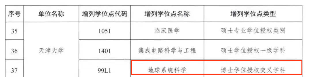 2022年7月12日,国务院学位委员会公布2022年增列学位授权点名单,天津大学地球系统科学一级学科博士学位授权点位列其中。这是全国首个地球系统科学交叉一级学科博士学位授权点。
