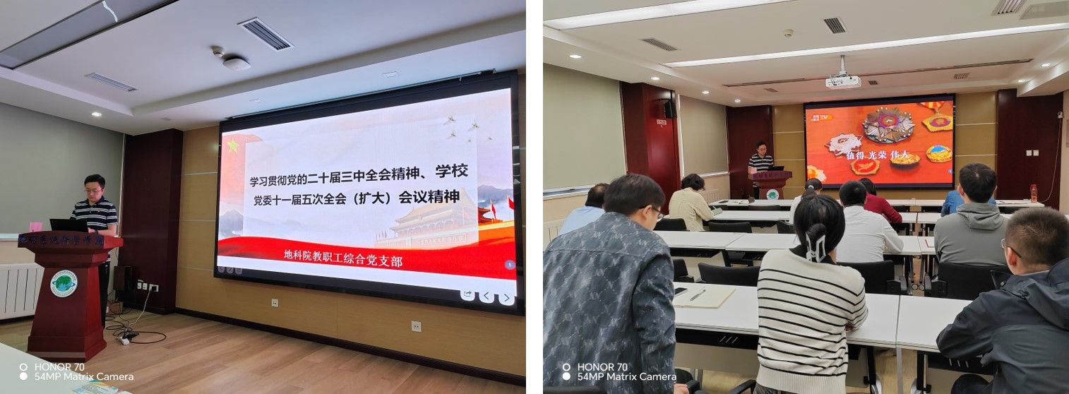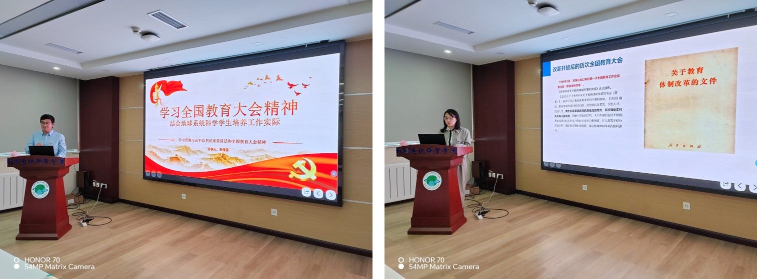 朱佳雷结合地球系统科学交叉学科学生培养工作实际,从复杂的系统工程——“六个力”详细解读学院在学生培养所做的工作。李灵枝以“教育的发展”为切入点,讲解改革开放后的历次全国教育工作会议精神,号召大家共同为2035年建成教育强国的奋斗目标努力。