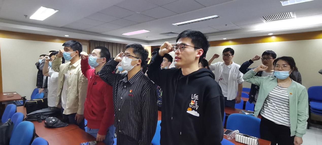 参观结束后,两校师生党员进行了座谈交流。党员们分别介绍了学校学院的基本情况,分享党建经验,互相勉励用所学服务国家建设,成长为有理想、有担当、有作为的新时代地学人。最后,4名学生党员同过政治生日,学生党员在辅导员的带领下重温入党誓词。