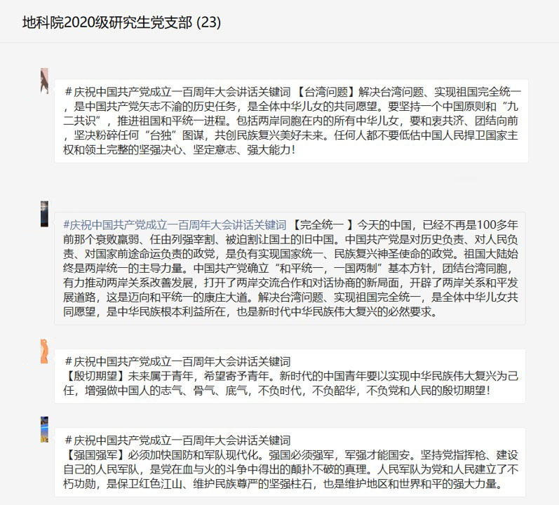 7月1日庆祝中国共产党成立一百周年大会上习近平总书记发表重要讲话,支部党员自发观看,同时支部交流平台内积极开展“庆祝中国共产党成立一百周年大会关键词接力”,共同感悟总书记的讲话精神,促学促研促领悟。
