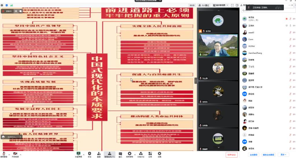 11月24日下午,地科院党委特别邀请中国科学院亚热带农业生态研究所党委书记、全国优秀科技工作者王克林研究员以《研究人与自然和谐共生的现代化途径,为西南喀斯特区域绿色转型发展提供科技支撑》为题交流学习贯彻党的二十大精神的心得体会,并组织党委理论学习中心组成员、党委委员、各师生党支部委员和师生代表开展示范学习。中科院院士、地科院院长刘丛强主持示范学习活动。