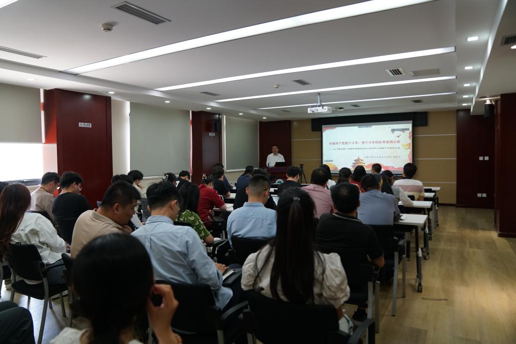 程斯宇以“中国共产党敢于斗争、善于斗争的经典案例分析——从紫石英号事件感悟历史和人民为什么选择了中国共产党”为题,从“紫石英”号事件的背景、过程出发,从“有勇”、“有谋”、“有节”等关键词切入,深入分析了事件进程中中国共产党彰显的作为和品质,引导党员深入理解中国共产党敢于斗争、善于斗争的优良传统,从过往的斗争实践中把握真正本质,从而在实际工作中开拓更为广阔的格局和天地。程斯宇结合程开甲和傅鹰两位科学家事例,勉励全体党员不仅要有“科学无国界”精神,更要发扬“科学家有祖国”精神,增强把握理想信念与能力本领的辩证关系,强化风险意识,加深对习近平总书记关键论断认识,推动各项工作高质量发展,推动中华民族伟大复兴早日实现。