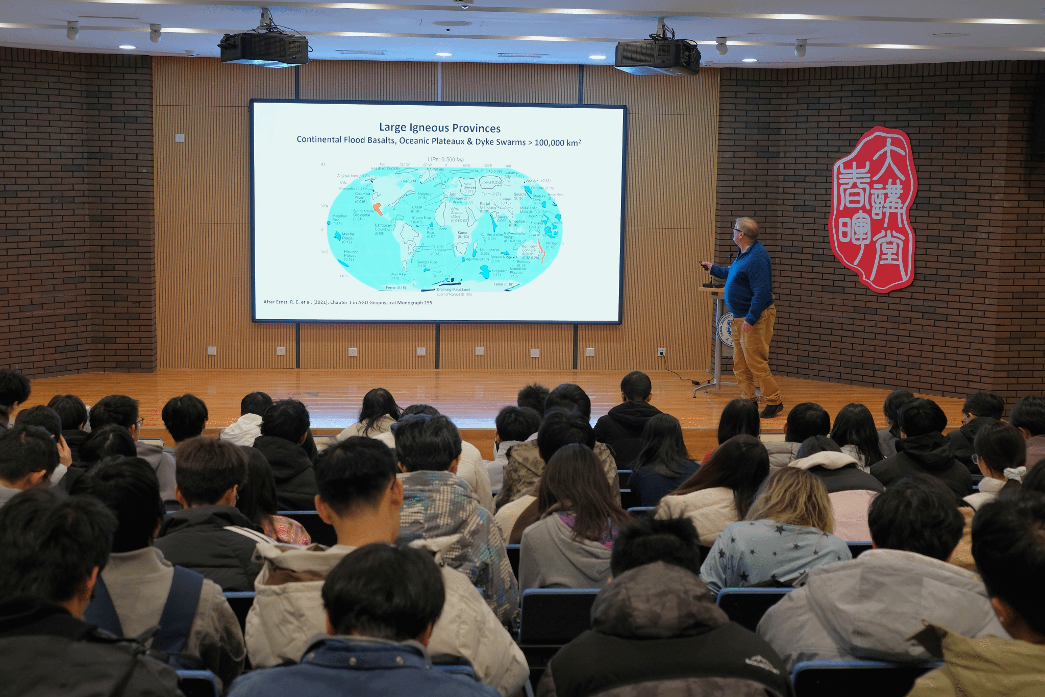 2025年12月10日,我院与外国语学院联合举办“春晖大讲堂”,我院讲席教授、英国爱丁堡皇家学会院士Robert Mark Ellam带来题为“Journey to the Centre of the Earth”的科普报告,引领师生穿越地表,探秘地球深部的组成、结构与演化奥秘。