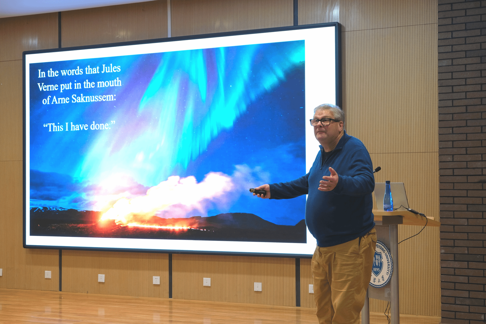 讲座伊始,Ellam教授以儒勒·凡尔纳的科幻小说《地心历险记》为切入点,将文学想象与现代科学研究巧妙连接,引发了现场观众对地球内部世界的浓厚兴趣。从小说中的冰岛火山口出发,他讲述了自己跨越四十余年、遍及五大洲的科研历程——从苏格兰岛屿的岩石断层,到意大利西西里岛的活火山,从非洲大陆的火成岩高原,到冰岛的热源与裂谷系统,是真正意义上的“全球地心探险”。