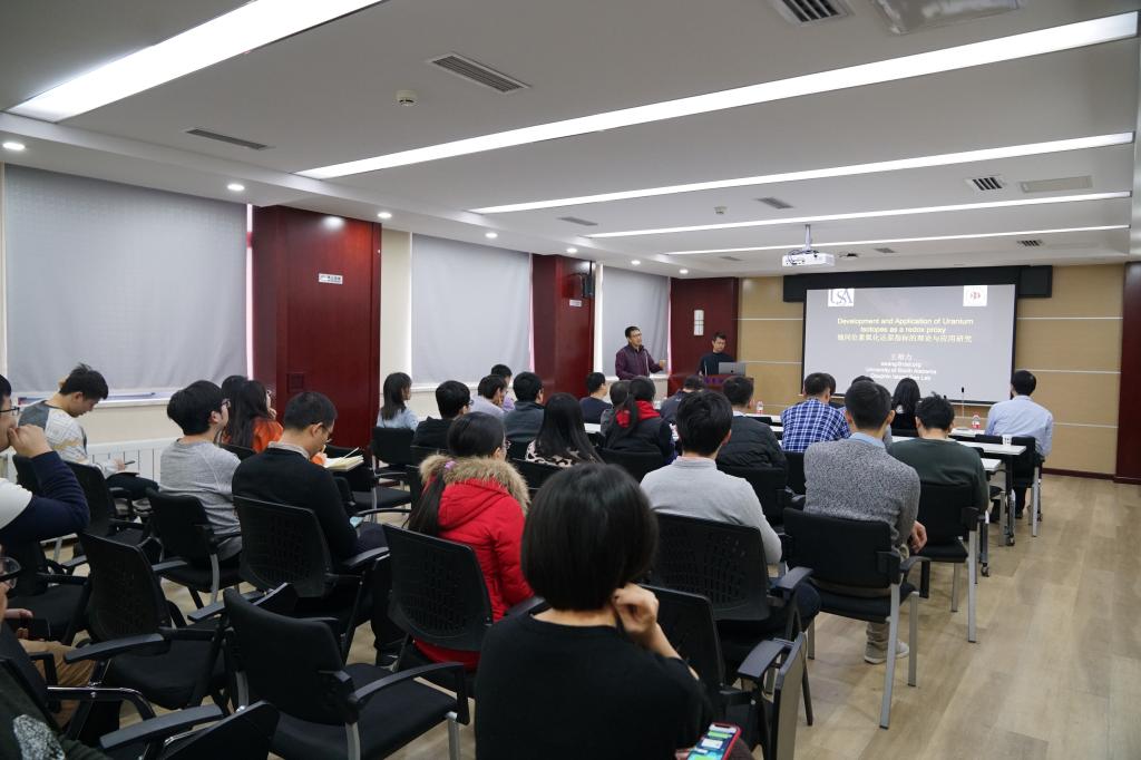 铀(Uranium)是原子序数为92的元素,其元素符号是U,是自然界中能够找到的最重元素。在自然界中存在三种同位素238U,235U和234U,均带有放射性,拥有非常长的半衰期。经典放射性年代学认为铀同位素(238U/235U)在太阳系具有均一值(137.88)。由于分析技术的进步,近期研究已发现自然界238U/235U具有显著分馏,在地学、环境科学等领域具有广阔的应用前景。王相力教授在本次报告中详细介绍了典型地质、环境过程中238U/235U的基本分馏理论,例举了铀同位素在环境和古海洋等领域应用研究的几个成功案例。报告后,与会师生与王相力教授进行了热烈的讨论。
