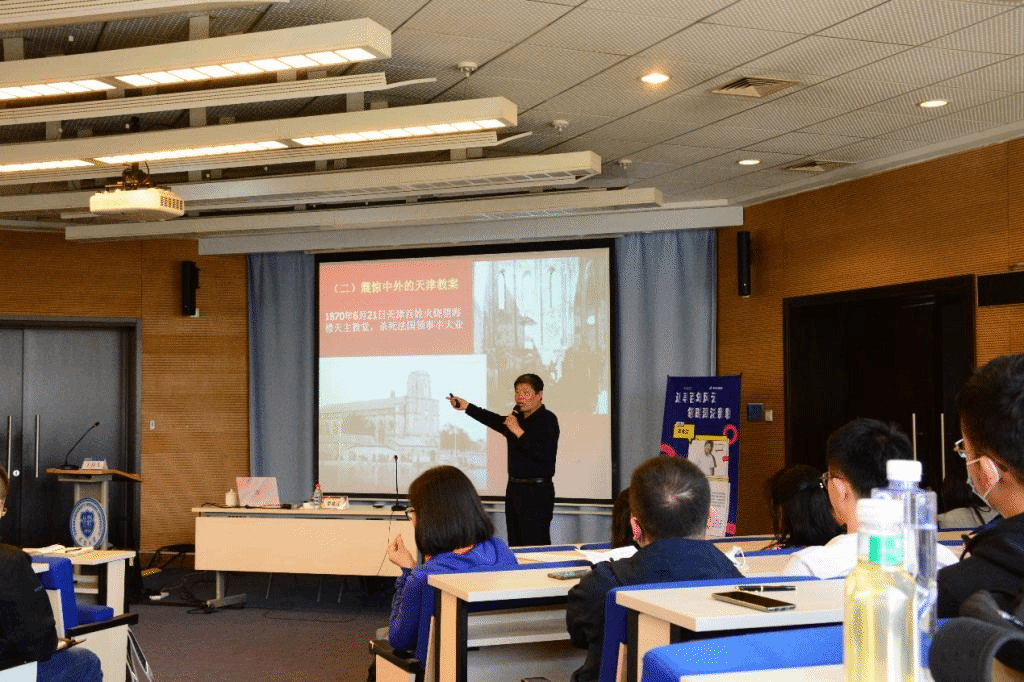 李兆江教授从“天津市的地缘优势和历史沿革”、“近代天津人们面对外来侵略英勇悲壮的抗争”、“近代民主思想的启蒙和红色革命活动”、“新中国成立后的城市巨变”几部分内容展开了生动有趣的讲解。