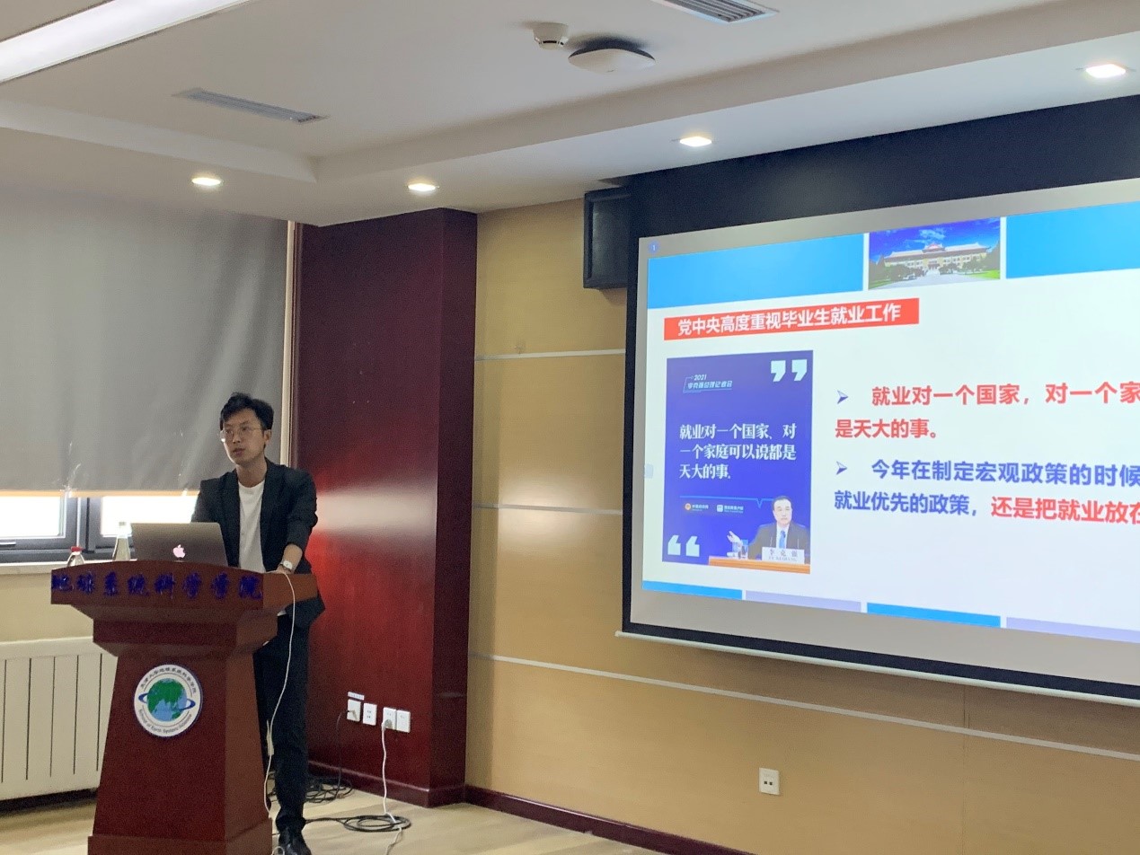 为促进学生全面了解就业形势和就业政策,及时进入就业准备期,5月7日下午,地科院邀请学校就业指导中心郑文博老师来院进行就业形势与政策宣讲,地科院党委副书记赵剑博出席活动。