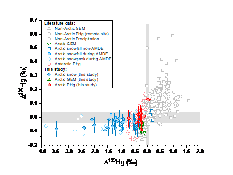 图2. 北极大气形态汞的同位素组成与文献数据的对比