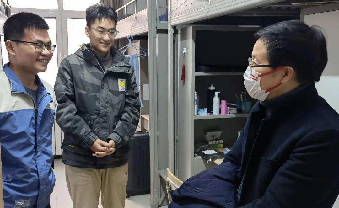 天津本轮新冠疫情突发,刘丛强院士第一时间返回学校,与学院师生们在一起。1月18日刘丛强院士走进2020级、2021级博士生工作室和15间一年级硕士生宿舍,走访看望在校学生,副院长李思亮、党委副书记赵剑博和辅导员李灵枝陪同。
