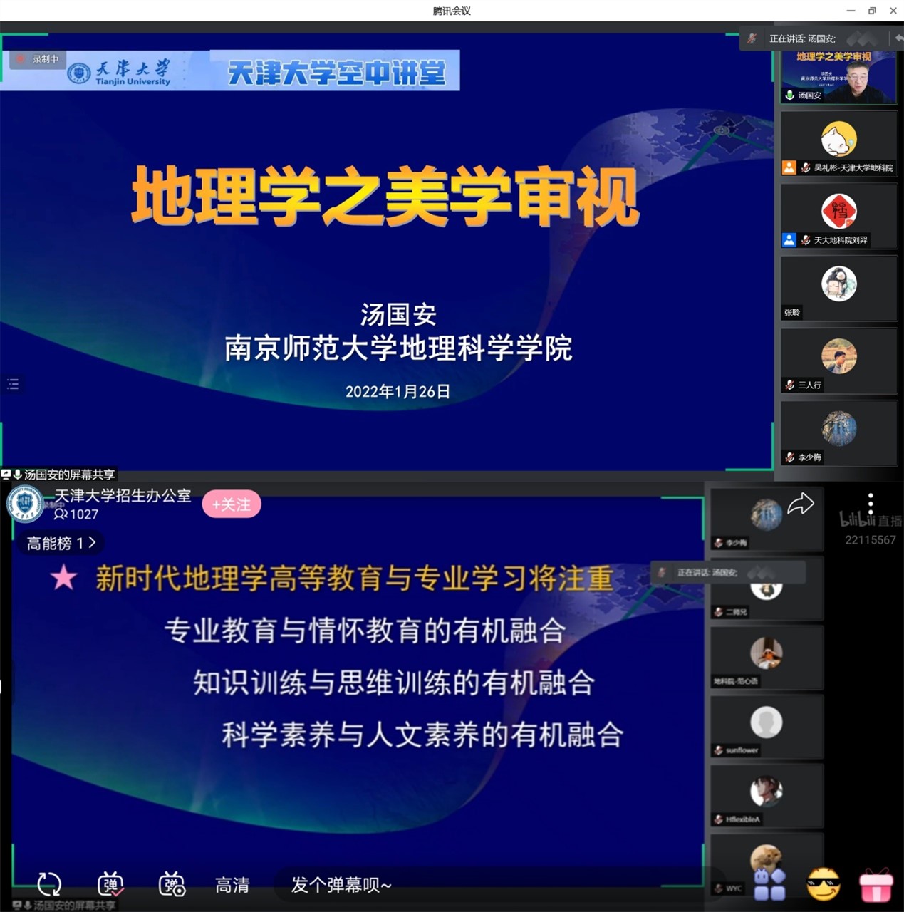 2022年1月26日,南京师范大学博士生导师、国家“万人计划”教学名师、“全国高校黄大年式教师团队”负责人汤国安教授应邀走进天津大学地科院空中讲堂,作题为“地理学之美学审视”的科普报告。报告在线上举办,并通过天津大学招生办官方B站进行直播,吸引了校内外1200余人聆听。报告由地理科学系主任刘羿教授主持。