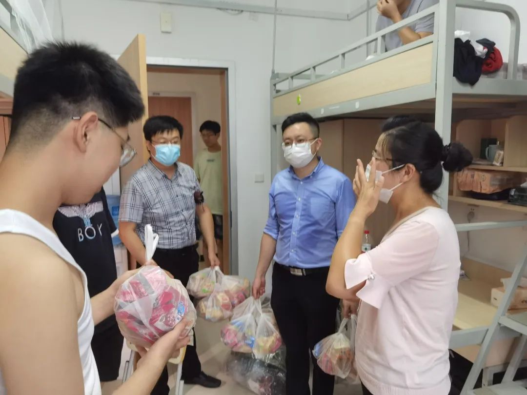 地科、海洋、环境的三位副书记带领新生排长在迎新工作间隙来到宿舍,看望刚刚入住的新生并送上给每个宿舍准备的零食礼包。老师和学长学姐们除了了解旅途和报到情况,关心是否适应,确认设施正常,还嘱咐新生关注入学教育安排。在愉快的交流氛围中,新生们回味着入学第一天的见闻与感受,憧憬着未来的大学生活。