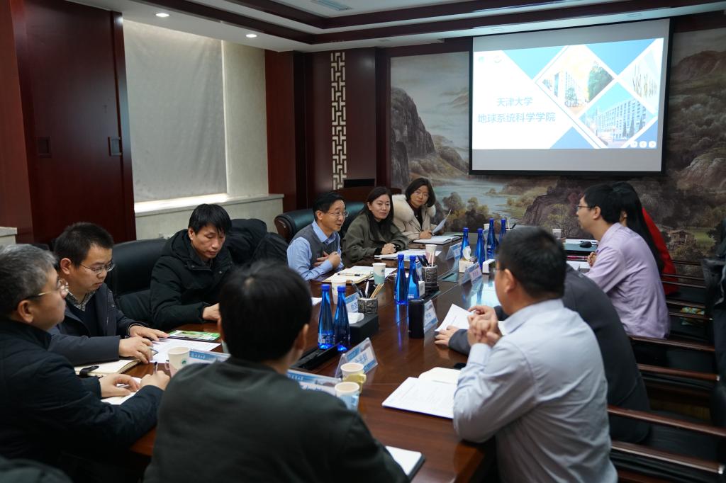 李思亮对代表团一行表示热烈欢迎,并简要介绍了地科院师资队伍、实验平台、科学研究、人才培养及野外观测站建设基本情况,希望双方在人才培养、科学研究、野外站建设等方面开展长期合作。张克强介绍了环监所的历史沿革、科研成果及野外站建设情况。他表示,天大地学历史悠久,地科院近年发展良好,在地球系统科学和环境生态等领域成果突出,希望能与地科院建立互惠合作关系,探索参与天开园等重点项目,共同为现代农业发展和乡村振兴战略实施提供科技支撑。