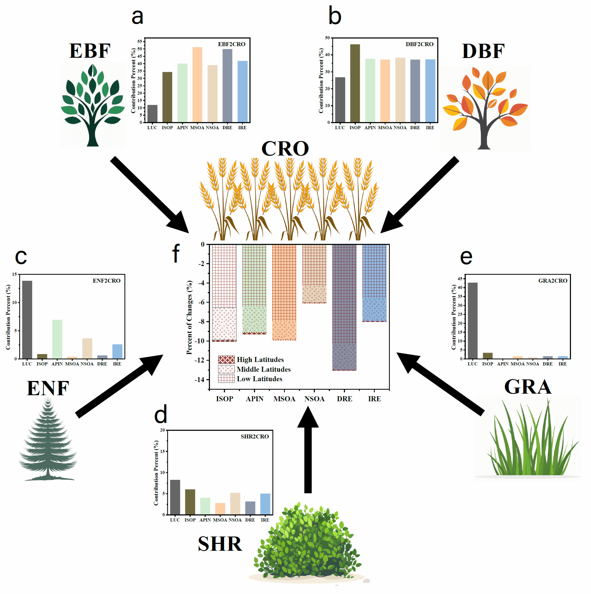 工业革命以来,为满足人口激增的粮食需求,人类大规模开垦农田,导致全球森林、草地锐减。这如何影响气候?传统认知聚焦于碳储存、反照率与水循环等的变化。然而,自然植被释放的挥发性有机物(VOCs),是形成二次有机气溶胶(SOA)的“原料”。大气SOA能直接影响太阳辐射(直接效应)并改变云的性质(间接效应),对地球气候系统起到重要的自然冷却作用。那么,当森林变农田,地球这层“降温屏障”是否受损?其气候代价有多大?这一关键问题长期被忽视。