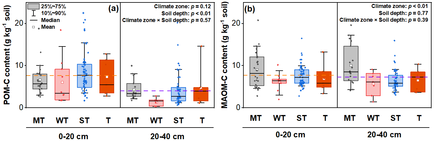 图1 四个气候带表层和亚表层水稻土中的POM-C和MAOM-C含量