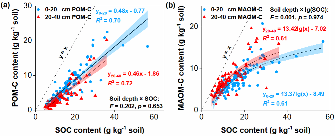 针对上述问题,我院宋照亮教授课题组基于全国104个稻田采样点的样本分析,揭示了POM与MAOM在不同土层(表层与亚表层)和气候带(中温带、暖温带、亚热带和热带)的分布规律及其环境调控因素。研究发现,MAOM在土壤有机碳中占比达45.3%–63.7%,尤其在亚表层土壤中贡献更为突出,表明MAOM是水稻土中更稳定、更核心的长期碳库(图1)。随着土壤有机碳总量升高,MAOM的积累速率会逐渐放缓,表现出“饱和”趋势;而POM则呈现线性增长,意味着对于已经富含有机碳的水稻土,通过管理措施继续提升POM库,是未来增强土壤碳汇能力的更有效途径(图2)。