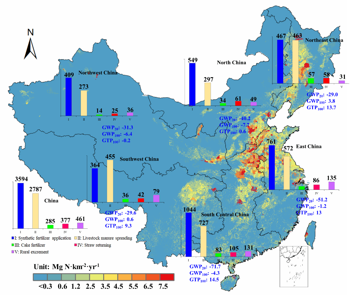 图1. 中国农田气体活性氮排放及其气候效应