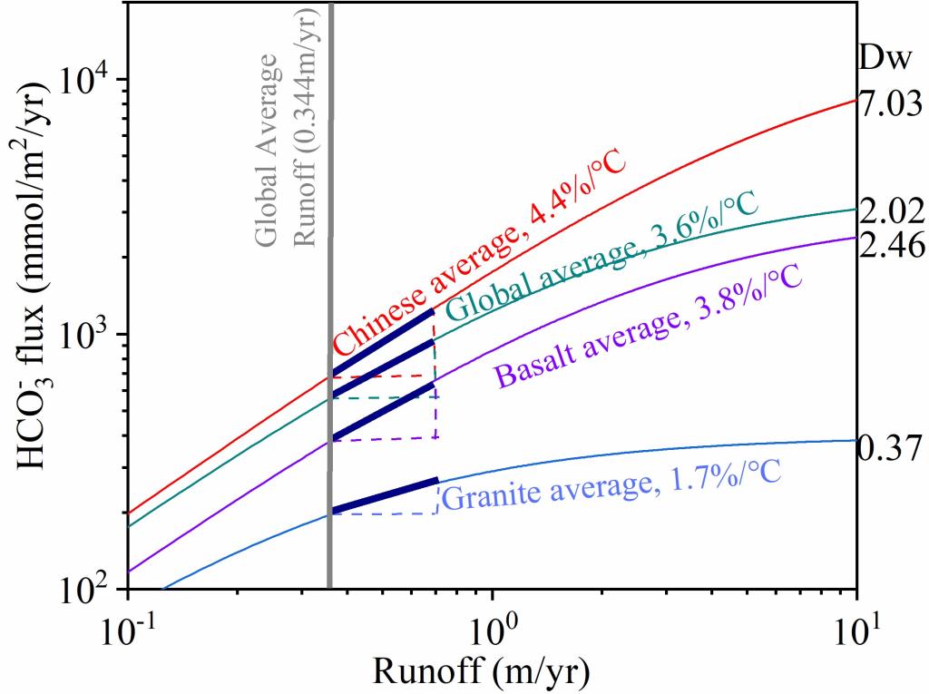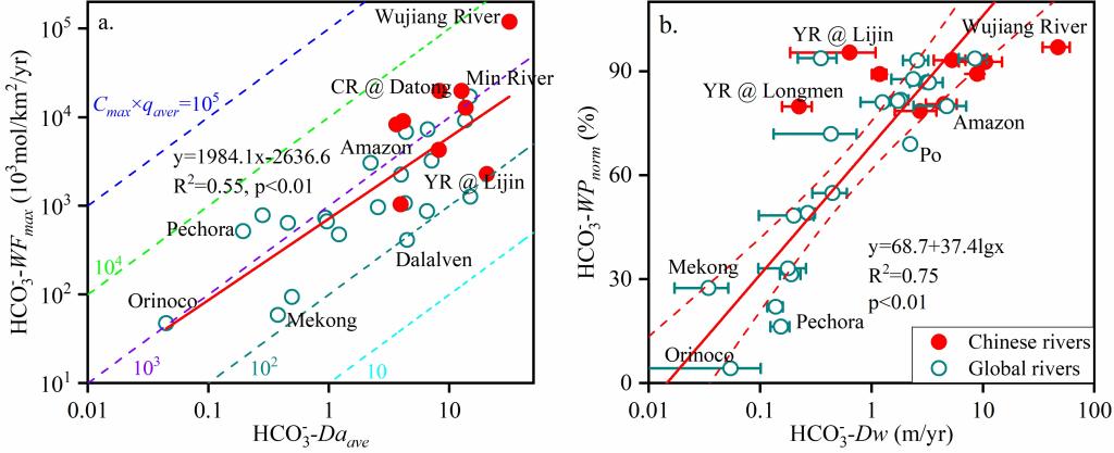 在本研究中研究人员采用经典的浓度-流量(C-Q)幂函数关系及新提出的溶质产生模型(Solute Production Model)解析了我国河流的C-Q关系,发现河流中的溶质浓度主要受控于流体运移时间与平衡所需时间的比值(Da)。通常,具有较高Da平均值(Daave)的河流具有较大的理论最大化学风化通量(WFmax;图1a),而河流中最大的化学风化潜力(WPnorm)却受控于Dw值(在流域尺度上风化介质中物质的反应活性;图1b)。从全球范围看来,HCO3-的行为及风化特征受碳酸盐岩的分布丰度影响。我国广泛的碳酸盐岩分布使得我国河流相比世界其它大多数河流,具有更大的风化通量以及风化潜力,并且对气候变化有更大的敏感性(4.4%/℃;图2)。这项研究工作揭示了流量、岩性、流体运移时间与风化通量之间的关系,并且分析了全球河流溶质动态变化的控制因素,这对探究全球变化下化学风化过程的变化具有重要意义。