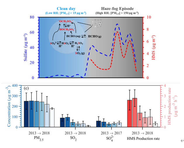 大气气溶胶中的含硫化合物可分为无机硫和有机硫组分。作为城市气溶胶中主要的无机硫组分,硫酸盐在大气化学模式中经常被低估,导致污染过程中高浓度的硫酸盐无法被模拟出来。重污染过程中SO2的关键氧化机制是大气复合污染研究的热点之一。此前的研究在量化气溶胶中含硫组分(硫酸盐、有机硫酸酯以及HMS)时存有偏差,未能准确解释硫酸盐爆发性增长的主导机制。