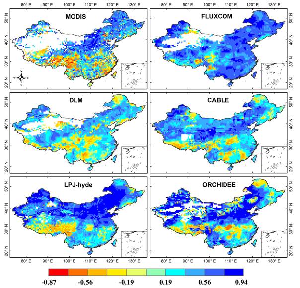 图 2 6种GPP数据与不同尺度标准降水蒸散发指数(SPEI)之间最大相关系数空间分布。