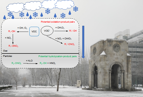 长期以来,研究者主要考虑大气环境中无机氮(NO3-、NH4+),而很少关注有机氮的沉降。有机氮是大气氮沉降的重要组分,本研究基于FT-ICR MS负离子模式对-ONO2分子的优先电离原则,指出大多数有机氮分子以有机硝酸酯的形式存在。针对有机氮分子提出了涉及氧化、水解过程的“潜在前体物-产物分子对”,解析出半数以上的有机氮分子可能是由氧化、水解过程形成的有机硝酸酯,它们可进一步通过降雪/雨的云中清除以及云下清除过程从大气环境中得到去除。