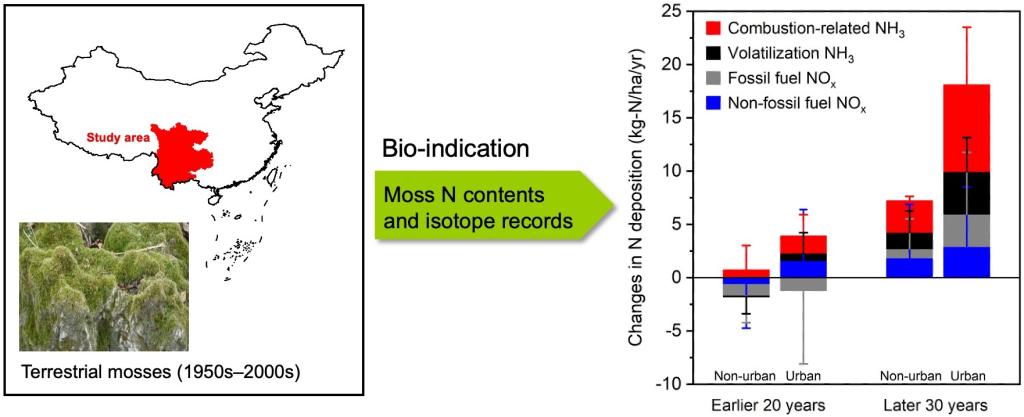 2000年以来,刘学炎等探索陆生苔藓总氮和硝酸根同位素(δ15N, δ18O, ∆17O)的记录原理和变化机制以及在评估氮沉降方面的应用,早期研究成果已在Applied Geochemistry (2008)、Environmental Pollution (2008, 2010, 2017)、Functional Plant Biology (2012)、Frontiers in Plant Science (2012)、ES&T (2012)、New Phytologist (2013)、Catena (2019) 、JGR: Atmospheres (2020)等发表。最近,他们分析中国西南城市和非城市地区1954–1964 年、1974–1990年、2005–2015年苔藓标本N含量和δ15N变化特征,结合苔藓N含量与氮沉降通量、苔藓δ15 N与铵态氮(NH4+)和硝态氮(NO3-)沉降的比例关系,详细评估了研究区大气氮沉降的通量和变化。西南地区无机态氮沉降通量在前两个时期无显著差异,但在2000年代后显著提高,且主要化学形态从1990 年代以前的NO3-转变为2000 年代后的NH4+,即NH4+的增加是导致氮沉降通量在2000年代后显著提高的主要原因。进而,通过同位素质量平衡重建了三个历史时期NH4+和NO3-沉降的δ15N信号,结合主要NH3和NOx排放源的δ15 N值,区分了主要燃烧源(生物质燃烧、机动车尾气、燃煤等)和挥发源(废水、废物和化肥 等)NH3、化石源(机动车尾气、燃煤)和非化石源(生物质 燃烧和土壤微生物氮循环)NOx的相对贡献,揭示燃烧源NH3和非化石源NOx对2000年代后氮沉降通量增加高有显著的贡献。