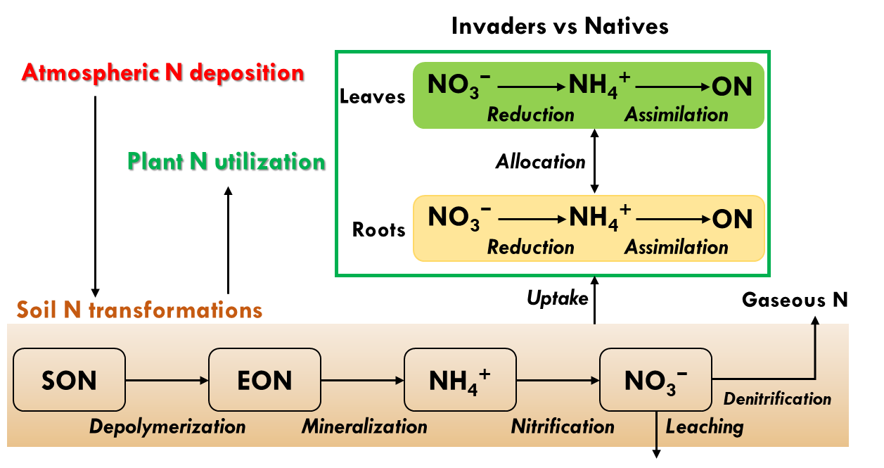 最近,天津大学地科院刘学炎课题组构建了利用氮同位素自然丰度评估土壤有机氮解聚、矿化、硝化、反硝化过程发生的比例,以及土壤铵氮和硝氮对植物根-叶总氮同化贡献的新方法。自本世纪初土壤主要形态氮同位素测试方法建立以来(Sigman et al. 2000 Anal Chem; Koba et al. 2010 RCM, 2012 JGR; Weigand et al. 2016 RCM),他们实现了上述土壤微生物氮循环过程的同位素定量解析(Xu et al. 2022 GBC)。自应用叶片氮同位素定量解译土壤铵氮和硝氮贡献以来(Houlton et al. 2007 PNAS; Liu et al., 2018 PNAS; Hu et al., 2019 J Ecol),他们重新考虑了植物根系的氮同位素、菌根氮吸收和根-叶氮分配的同位素效应,提高了约束植物铵硝同化贡献和偏好度的准确性(Hu et al., 2022 STE)。进而,他们对东亚地区不同氮沉降通量下的森林土壤氮同位素,以及中国西双版纳受外来物种不同程度入侵下的植物氮同位素分别进行观测和分析,发现:1)大气氮沉降增加促进森林土壤氮解聚、矿化和硝化作用,但减少硝酸根的总丢失比例;在硝酸根总丢失中,微生物反硝化过程相对于淋溶过程的贡献随氮沉降增加而增加。该研究定量评估了氮沉降增加如何及多大程度促进森林土壤氮素的微生物转化过程(Xu et al. 2022 GBC)。2)外来入侵植物(飞机草和紫茎泽兰)叶片中来自土壤铵氮和硝氮的贡献均高于根系,其叶片相对于根系更优先的氮分配策略总体强于本地植物。相对于无入侵下的同种植物,共存本地植物也表现出了叶片氮分配优先的策略,但仅体现在铵氮上。该研究揭示叶片优先的氮分配是植物能够入侵和共存的重要策略之一(Hu et al., 2022 STE)。