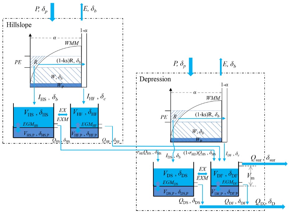 针对西南喀斯特典型流域下垫面结构和水文特征,天津大学地科院陈喜教授团队构建了反映流域山坡-洼地水力联系的半分布式水文-氢氧同位素耦合模型,在模型不同单元(山坡和洼地)和不同水流系统(快、慢速流系统)中设置被动水箱蓄量,识别最佳模型结构。通过在山坡慢、快速流和洼地慢速流系统中配置1~3个被动水箱蓄量,有效提高了模型对径流和同位素过程的模拟精度,并反映了山坡和洼地两单元之间的主要水流路径以及山坡单元与洼地、流域出口之间的水力连接方式。
