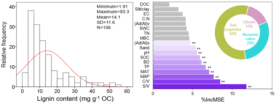 木质素作为一种主要的植物源性土壤有机碳组分,是反映滨海湿地不同植被组成和气候带下生物地球化学特征的独特生物标志物。然而,植物源木质素的纬度分布模式及其稳定性和控制机制仍不清楚。本研究我们沿着5000 km海岸带在39个样点共采集了156个土壤样品(0-40 cm),以探索生物和环境因素对木质素分布模式的影响。结果表明,木质素的含量范围为1.91至83.3 mg g−1 OC,在盐沼湿地中与SOC呈正相关,在红树林中与SOC呈弱负相关。SOC或木质素含量与C/V或S/V(肉桂基或丁香基与香草基的比值)呈正相关,而SOC或木质含量与(Ad/Al)V或(Ad/Al)S(香草基或丁香基的酸醛比)总体呈负相关,证实了生物标志物木质素单体降解参数的可靠性。研究发现,植物碳输入和木质素单体比值直接影响土壤中木质素的承载量。木质素含量和稳定性主要受土壤特性(即pH、EC、砂粒/黏粒)的控制。年均温(MAT)通过促进分解和改变植被与土壤生物地球化学(即微生物的底物可利用性)间接影响木质素的分布模式。