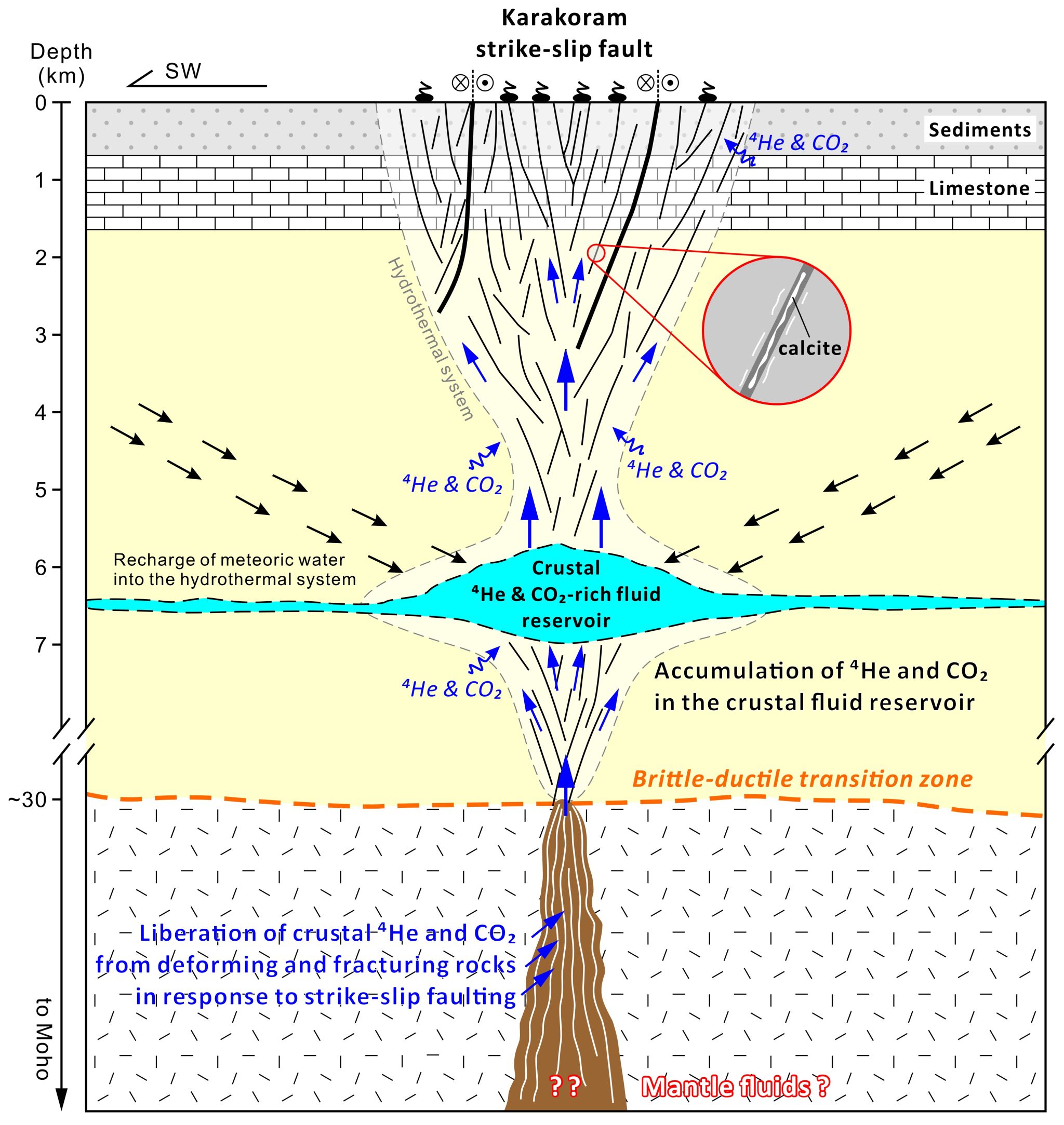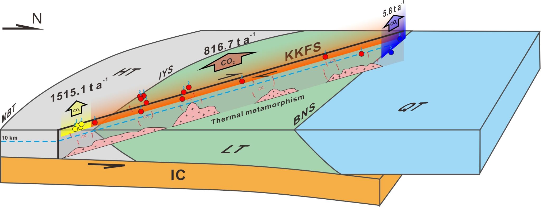 针对上述问题,天津大学地球系统科学学院徐胜教授团队与国内外合作者聚焦青藏高原西部的喀喇昆仑右旋走滑断裂,利用温泉气体与温泉水的元素与同位素地球化学指标和定量计算模型,厘清了喀喇昆仑断裂带南段的含碳流体的来源与成因机制,探讨了深源流体对喀喇昆仑断裂切割深度和剪切变形的指示意义。此外,研究团队量化了喀喇昆仑断裂地下水热系统中溶解无机碳的来源贡献比例,并对温泉逸出态和溶解态CO2释放规模进行了初步估算。