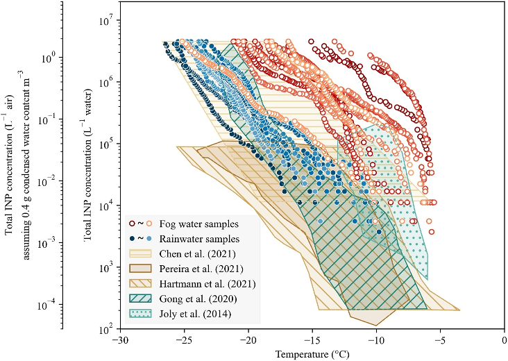 近日,我院傅平青教授团队利用基于冷台的液滴冻结法测定了庐山顶采集的降水(雨水、云雾水)中的总冰核颗粒物(INPs,图1)、生物性INPs、细菌性INPs、纳米INPs(<0.22 μm)和生物性纳米INPs;并分别利用超高分辨率傅立叶变换离子回旋共振质谱技术(FT-ICR MS)和高通量测序技术对庐山降水样品中有机分子和微生物群落组成进行了精准识别。