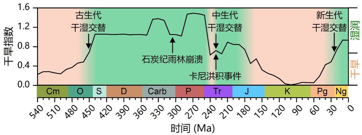 最近,天津大学地球系统科学学院刘学炎课题组发现华南地区下寒武统牛蹄塘组平引剖面黑色页岩具有较高的硝酸根离子(NO3-)含量(平均2.4 ± 3.8 mg N kg-1)和17O同位素异常(17O值平均11.0 ± 7.4 ‰)。结合现代海洋和陆地土壤和沉积物NO3-含量和17O值综合分析,推断其中的NO3-源于华南板块构造隆升后发生干旱气候时期的大气NO3-保存和积累,而非古海洋NO3-残留和现代地表大气和土壤NO3-下渗所致。结合沙漠土壤NO3-17O观测数据、古气候数据、煤和蒸发岩沉积记录数据,并运用机器学习模拟了华南显生宙千万年分辨率的干湿程度,较好地重建了三次重要的气候转变:1)寒武纪-奥陶纪干旱气候向志留纪-二叠纪湿润气候的转变,2)二叠纪-三叠纪之交干旱气候向中三叠世-早侏罗世湿润气候的快速转变,3)侏罗纪-白垩纪-古近纪干旱气候以及晚白垩世极端干旱气候向新近纪以来湿润气候的转变(图1)。