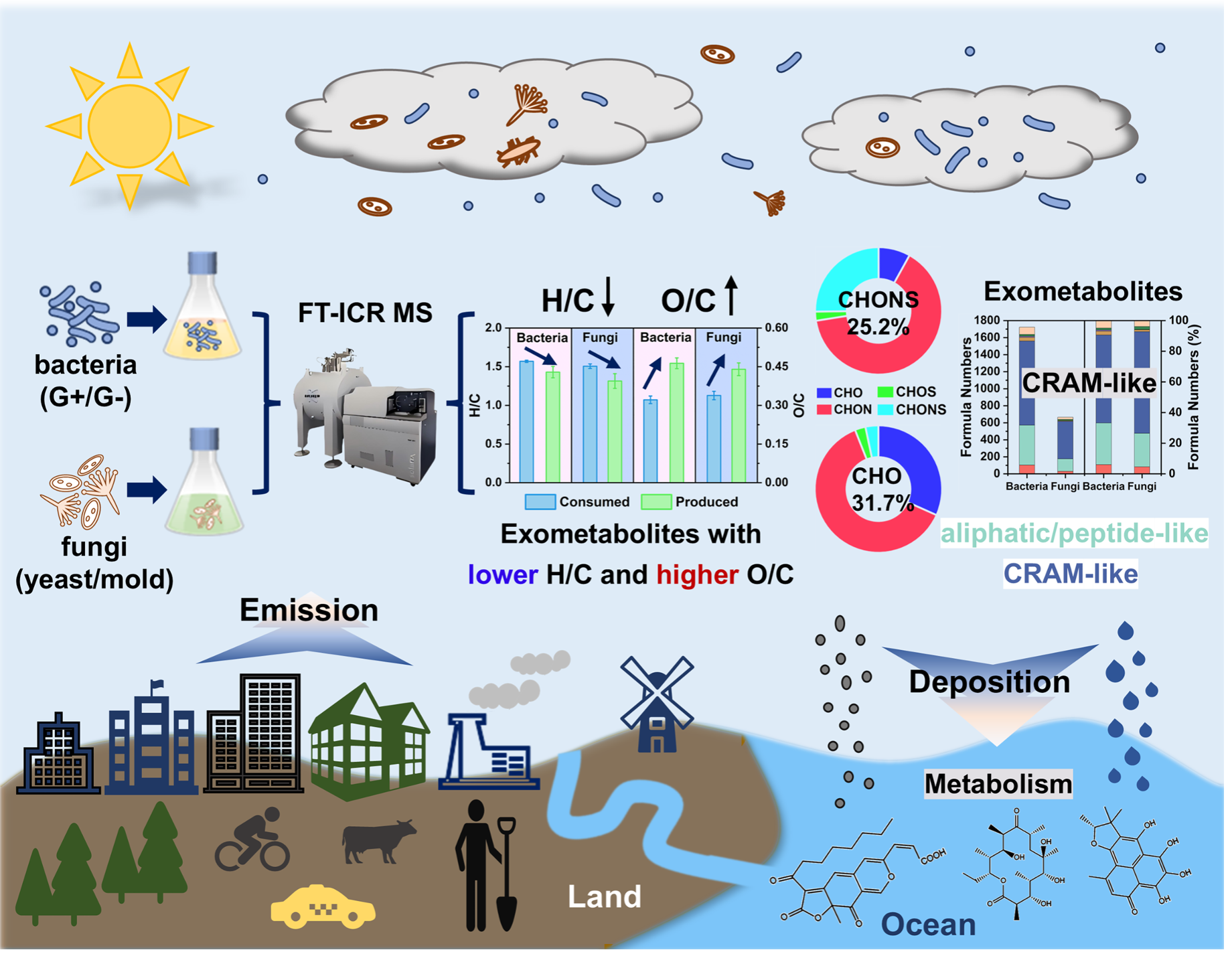 近日,我院傅平青教授团队利用超高分辨率傅里叶变换离子回旋共振质谱(FT-ICR MS)技术,深入剖析了从城市大气中分离的典型细菌和真菌的外代谢产物的分子组成特征,揭示了这些微生物的重要代谢过程,为理解大气微生物与表层地球系统之间的复杂联系提供了有力证据。