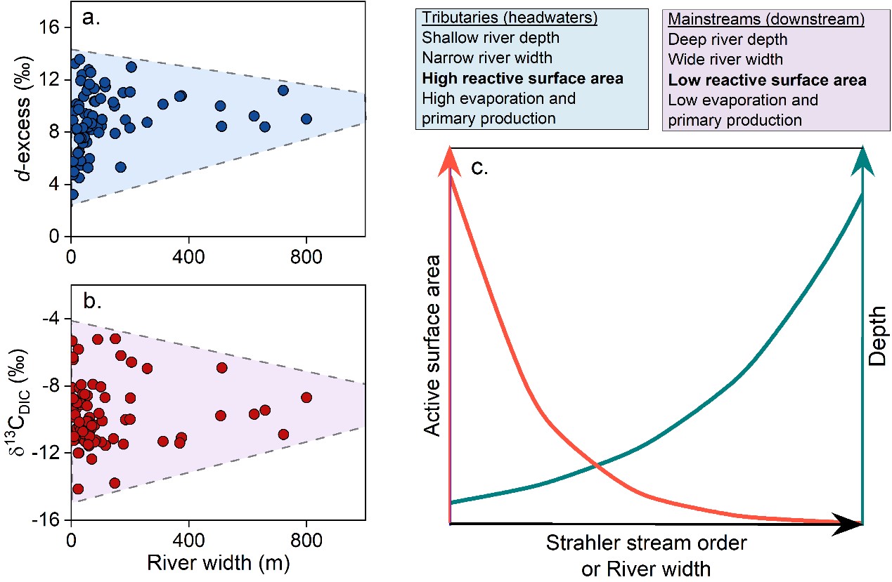 图 河流中氘盈余(d-excess)与河流宽度(River width)(a)及d13CDIC(b)与河流宽度之间的关系,不同梯度河流中水-气界面面积及河流深度的变化关系(c)