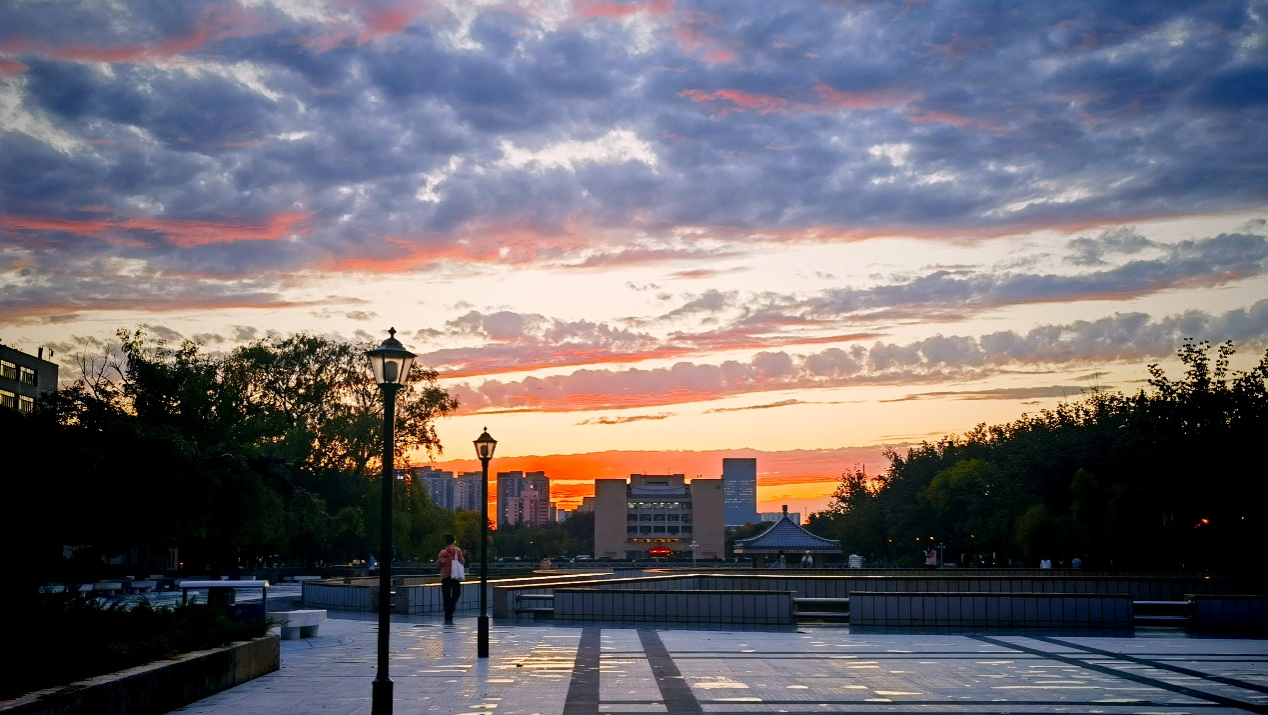 天大的晚霞独一无二,夕阳缓缓西沉,将整片湖水映成梦幻的橙粉色。柳枝在微风中摇曳,仿佛为这幅静谧的校园画卷增添了几分柔美。远处教学楼的剪影与落日的倒影交相辉映。