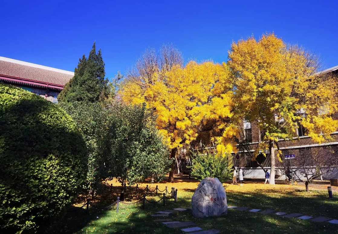 秋风飒飒,牛顿苹果树翠郁葱茏,恍若夏日的余韵未尽;海棠的金黄秋叶已然缓缓飘落,昭示着秋天的到来。两者相互映衬,构成了天津大学秋日画卷绮丽多彩的一角。